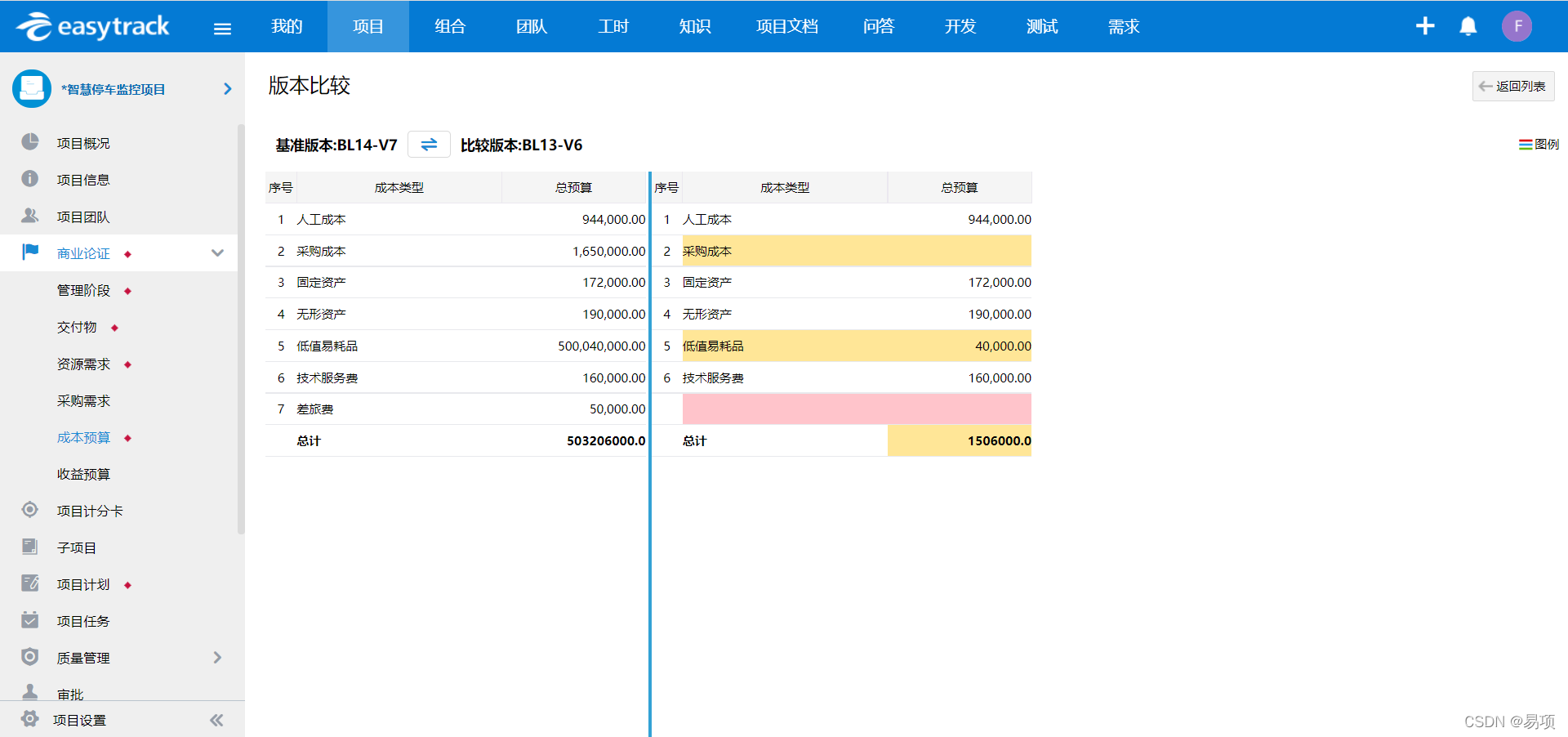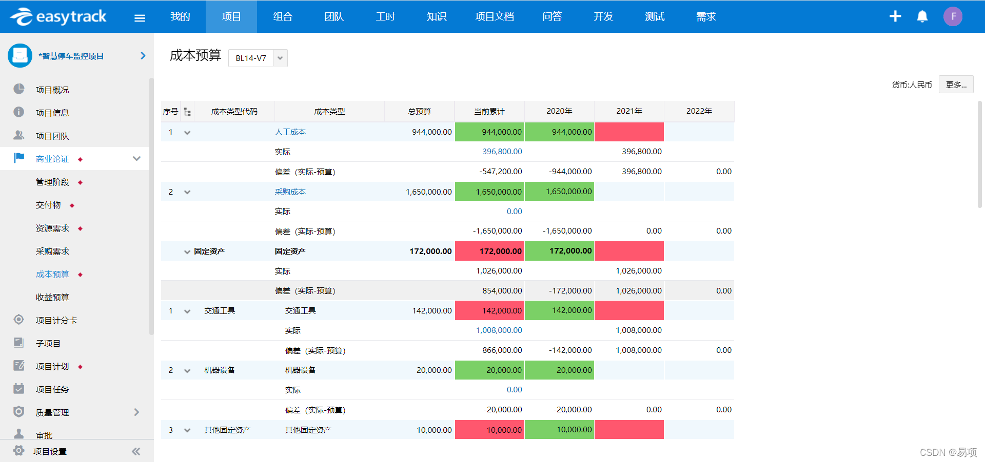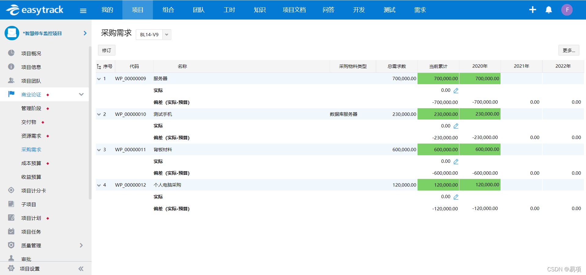 商业论证最重要的是就是对项目价值的判断,也就意味着对项目成本和收益的评估,结合阶段计划,制定不同阶段的项目成本和收益的预算。在易趋上,对项目的成本预算计划可以分为人工成本(通过工时体现)、费用成本、采购成本和固定资产。项目采购计划和资源需求计划在项目成本预算中最为重要,所以需要单独进行重点规划,最终统一到项目成本预算中。