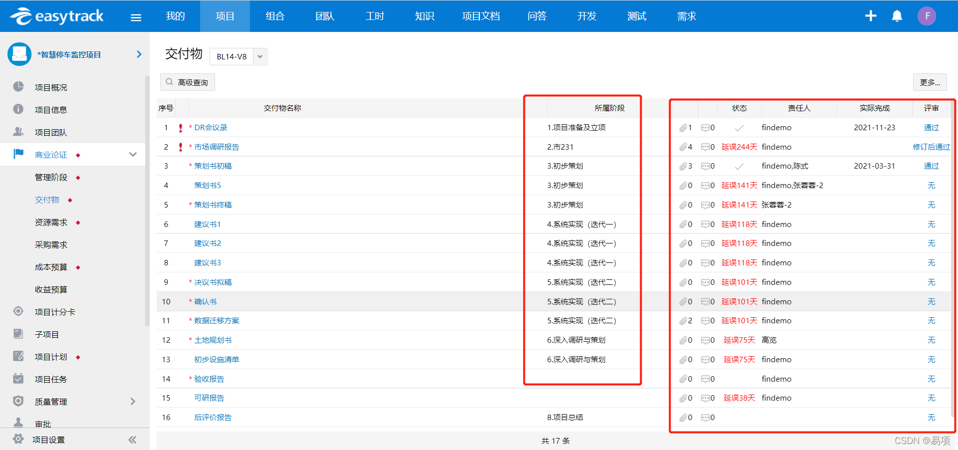 如图2,项目是否可以推进到下一阶段,以对应交付物的验收通过为基准,交付物会链接所属阶段和对应的责任人。