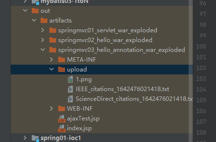 public class FileController {//法一//@RequestParam("file") 将name=file控件得到的文件封装成CommonsMultipartFile 对象//批量上传CommonsMultipartFile则为数组即可@RequestMapping("/upload")public String fileUpload(@RequestParam("file") CommonsMultipartFile file , HttpServletRequest request) throws IOException {//获取文件名 : file.getOriginalFilename();String uploadFileName = file.getOriginalFilename();//如果文件名为空,直接回到首页!if ("".equals(uploadFileName)){return "redirect:/index.jsp";}System.out.println("上传文件名 : "+uploadFileName);//上传路径保存设置String path = request.getServletContext().getRealPath("/upload");//如果路径不存在,创建一个File realPath = new File(path);if (!realPath.exists()){realPath.mkdir();}System.out.println("上传文件保存地址:"+realPath);InputStream is = file.getInputStream(); //文件输入流OutputStream os = new FileOutputStream(new File(realPath,uploadFileName)); //文件输出流//读取写出int len=0;byte[] buffer = new byte[1024];while ((len=is.read(buffer))!=-1){os.write(buffer,0,len);os.flush();}os.close();is.close();return "redirect:/index.jsp";}//法二/** 采用file.Transto 来保存上传的文件*/@RequestMapping("/upload2")public String fileUpload2(@RequestParam("file") CommonsMultipartFile file, HttpServletRequest request) throws IOException {//上传路径保存设置String path = request.getServletContext().getRealPath("/upload");File realPath = new File(path);if (!realPath.exists()){realPath.mkdir();}//上传文件地址System.out.println("上传文件保存地址:"+realPath);//通过CommonsMultipartFile的方法直接写文件file.transferTo(new File(realPath +"/"+ file.getOriginalFilename()));return "redirect:/index.jsp";}