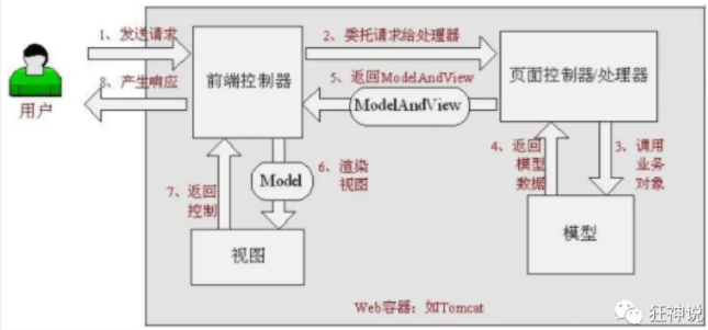 当发起请求时被前端控制器拦截到请求,根据请求参数生成代理请求,找到请求对应的实际控制器,控制器处理请求,创建数据模型,访问数据库,将模型响应给中心控制器,控制器使用模型与视图渲染视图结果,将结果返回给中心控制器,再将结果返回给请求者。、