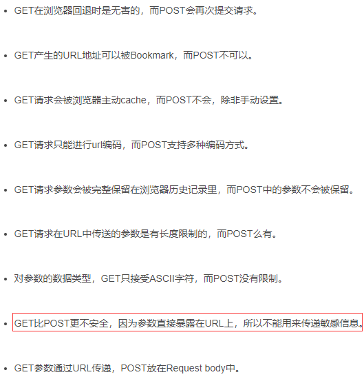 一个重大区别:对于GET方式的请求,浏览器会把http header和data一并发送出去,服务器响应200(返回数据);而对于POST,浏览器先发送header,服务器响应100 continue,浏览器再发送data,服务器响应200(返回数据)。在网络环境好的情况下,发一次包的时间和发两次包的时间差别基本可以无视;而在网络环境差的情况下,两次包的TCP在验证数据包完整性上,有非常大的优点。
