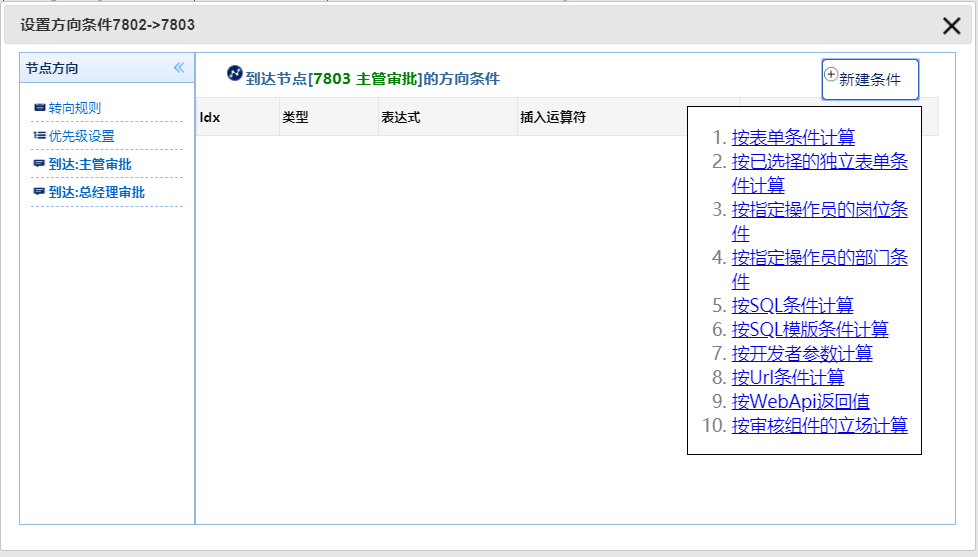 节点的转向规则主要分成了三种模式:发送按钮旁的下拉框选择、由连接线条件控制、发送后手工选择到达节点与接收人,这里的我们重点说的是第二种由连接线条件控制