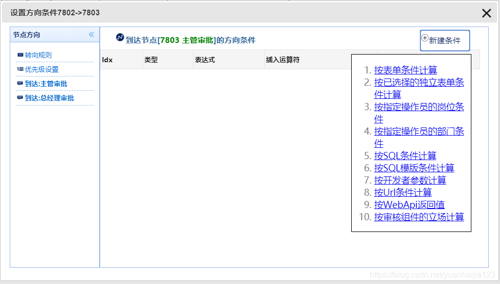节点方向,就是从一个节点到另外一个节点的连接线。节点的方向条件依附于这个连接线配置的业务逻辑表达式,返回true,false。返回true就是可以通过,false就是不通过。多个方向条件可以混合使用。