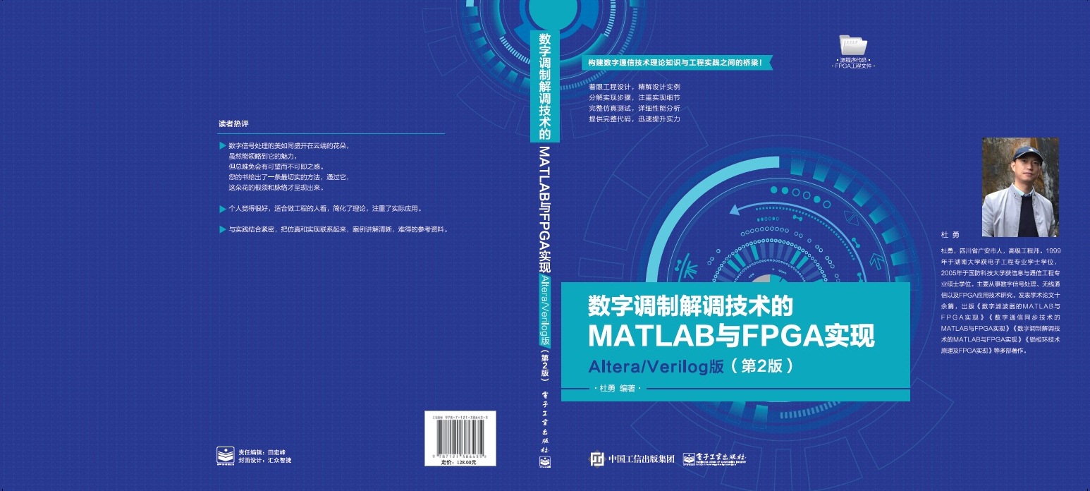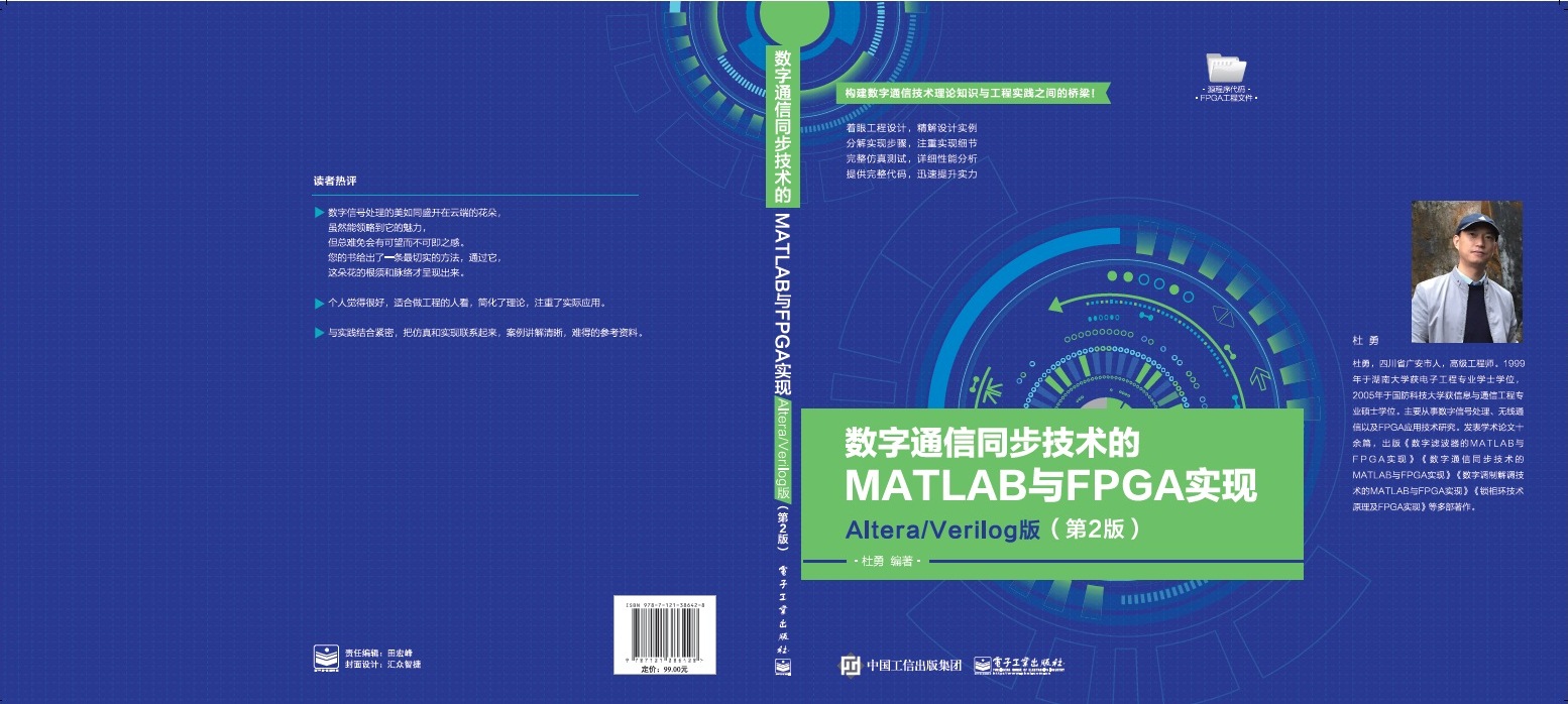 大家好!我的新书《数字通信同步的MATLAB与FPGA实现——Altera/Verilog版(第2版)》、《数字调制解调技术的MATLAB与FPGA实现——Altera/Verilog版(第2版)》已开始印刷,即将全国发行,敬请关注!