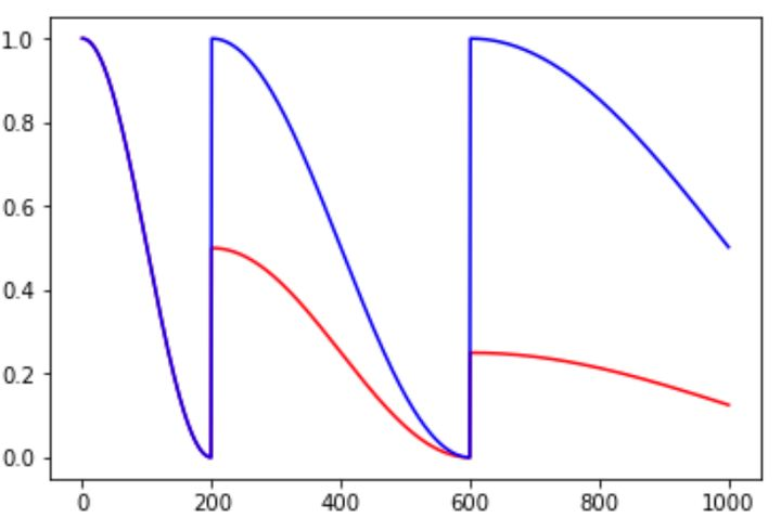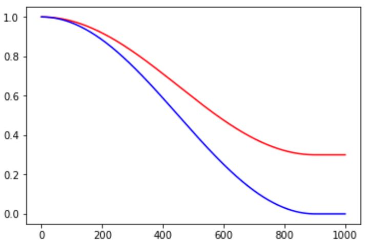 图、cosine_decay_restarts示例,红色线条t_mul=2.0,m_mul=0.5,蓝色线条t_mul=2.0,m_mul=1.0