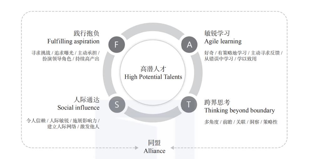 F—践行抱负(Fulfilling aspiration):相比于一般人才,高潜人才人才渴望承担更大责任、追求更多的职业发展空间,并且愿意投入时间和精力去实现。特征是:寻求挑战 / 追求曝光 / 主动承担 / 扮演领导角色 / 持续高产出