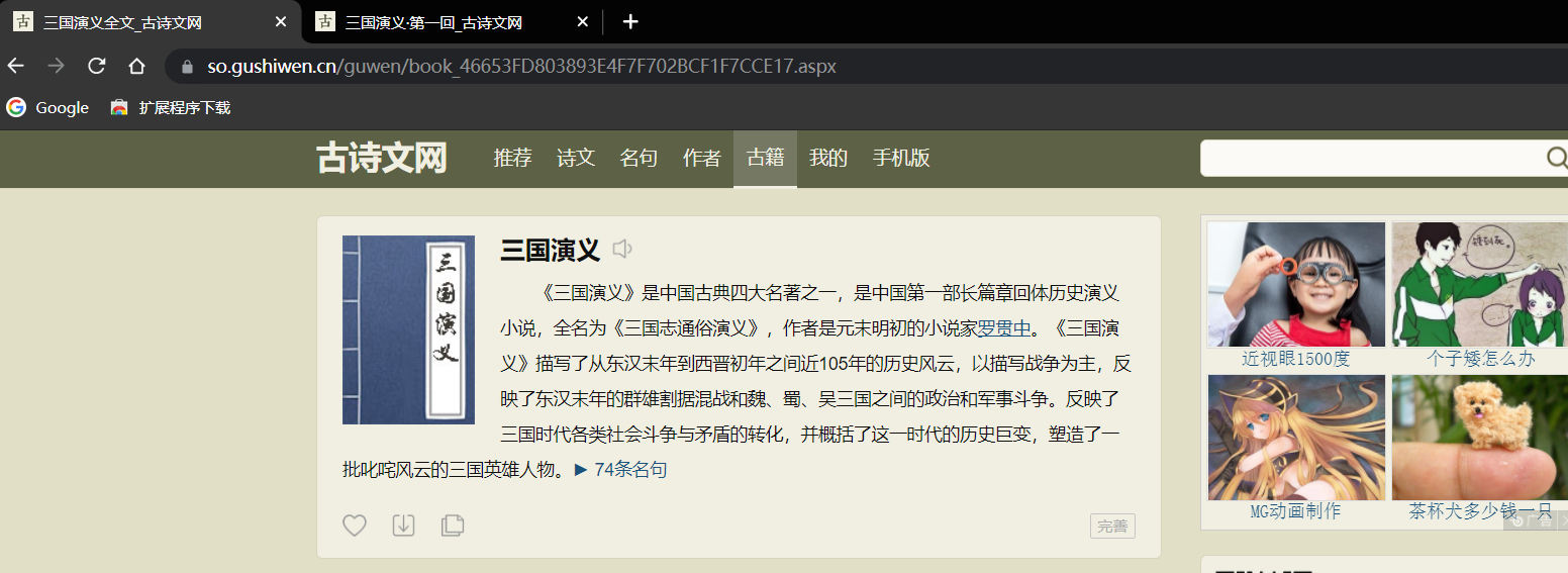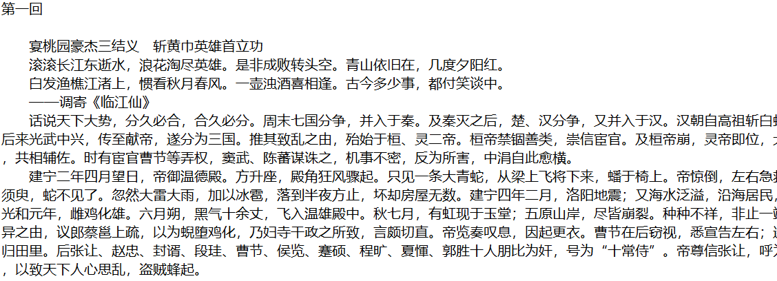 a_text = soup.select('.bookcont a') #将其下面的所有a标签提取出来for i in a_text:#获取a标签中的href属性的值detail_url = i['href']#请求详细内容的url的内容detail_content = requests.get(detail_url,headers,timeout=4).textsoup = BeautifulSoup(detail_content,'html.parser')#提取class标签class_content = soup.find('div',class_='contson')#print(class_content) #该标签中有很多p标签,返回整个class_content标签#print(class_content.text) #获取其所有的内容with open('三国演义.txt','a',encoding='utf-8') as f:f.write(i.text+'\r')f.write(class_content.text+'\r')print(f'爬取{i.text}ok')