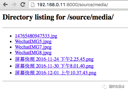 python -m SimpleHTTPServer 接下来用 ifconfig (windows 下是 ipconfig)查看你的内网 ip, 假设是 192.168.0.11, 在浏览器输入http://192.168.0.11:8000 即可看到