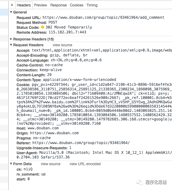 headers = {'User-Agent': 'Mozilla/5.0 (Macintosh; Intel Mac OS X 10_12_1) AppleWebKit/537.36 (KHTML, like Gecko) Chrome/51.0.2704.103 Safari/537.36', 'Cookie': '******'}requests.post('https://www.douban.com/group/topic/93461964/add_comment', data=payloads, headers=headers) 这种方式去刷帖肯定是有风险的,所以请大家谨慎使用