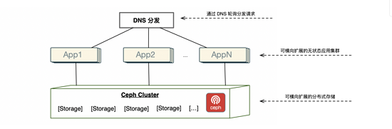Ceph 是一个分布式文件系统,它的主要目标是设计成基于POSIX的没有单点故障的分布式文件系统,能够轻松的扩展到数PB级别的容量,所以当时的想法是借助于 Ceph 的横向扩容能力以及高可靠性,实现对存储系统的扩容,并且在存储系统上层提供多组无状态的应用,使这些应用共享 Ceph 存储,从而进一步实现了计算资源扩容的目的。