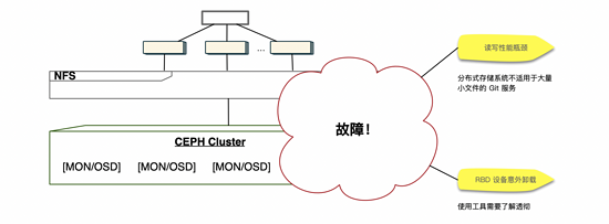 而且随着使用量的增加,每到工作日的高峰期,比如早上9点左右,下午5点左右,是推拉代码的高峰期,机器的IO几乎是满负载的,所以每到这个时候整个系统都会非常缓慢,所以系统扩容的事情刻不容缓。经过讨论,团队决定选择使用分布式存储系统 Ceph,在经过了一系列不算特别严谨的「验证」后(这也是后面出问题的根本原因),我们就采购机器开始进行系统的扩容了。