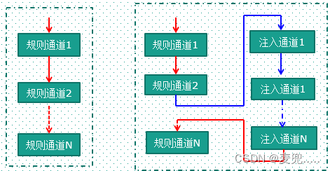 规则通道组和注入通道组。规则通道相当于你正常运行的程序,而注入通道呢,就相当于中断。在你程序正常执行的时候,中断是可以打断你 的执行的。同这个类似,注入通道的转换可以打断规则通道的转换, 在注入通道被转换完成之 后,规则通道才得以继续转换。