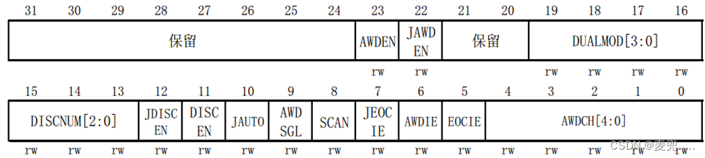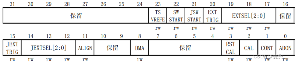ADON 位用于开关 AD 转换器。而 CONT 位用于 设置是否进行连续转换,我们使用单次转换,所以 CONT 位必须为 0。CAL 和 RSTCAL 用于 AD 校准。ALIGN 用于设置数据对齐,我们使用右对齐,该位设置为 0。