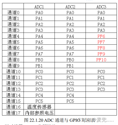 1)开启 PA 口时钟和 ADC1 时钟,设置 PA1 为模拟输入。 STM32F103ZET6 的 ADC 通道 1 在 PA1 上,所以,我们先要使能 PORTA 的时钟和 ADC1 时钟,然后设置 PA1 为模拟输入。使能 GPIOA 和 ADC 时钟用 RCC_APB2PeriphClockCmd 函 数,设置 PA1 的输入方式,使用 GPIO_Init 函数即可。这里我们列出 STM32 的 ADC 通道与 GPIO 对应表: