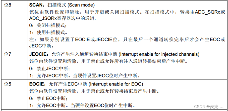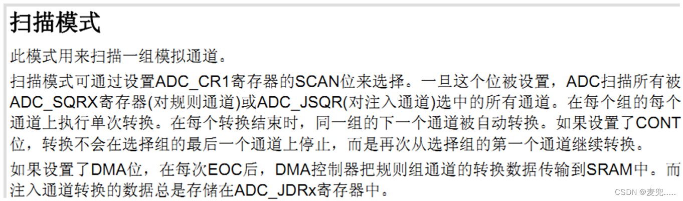 ADC_CR1 的 SCAN 位,该位用于设置扫描模式,由软件设置和清除,如果设置为 1,则 使用扫描模式,如果为 0,则关闭扫描模式。在扫描模式下,由 ADC_SQRx 或 ADC_JSQRx 寄 存器选中的通道被转换。如果设置了 EOCIE 或 JEOCIE,只在最后一个通道转换完毕后才会产 生 EOC 或 JEOC 中断。