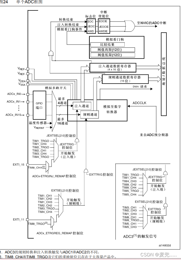 STM32 其 ADC 的规则通道组最多包含 16 个转换,而注入通道组最多包含 4 个通道。