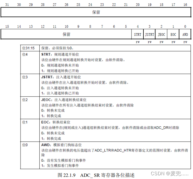 后一个要介绍的 ADC 寄存器为 ADC 状态寄存器(ADC_SR),该寄存器保存了 ADC 转 换时的各种状态。