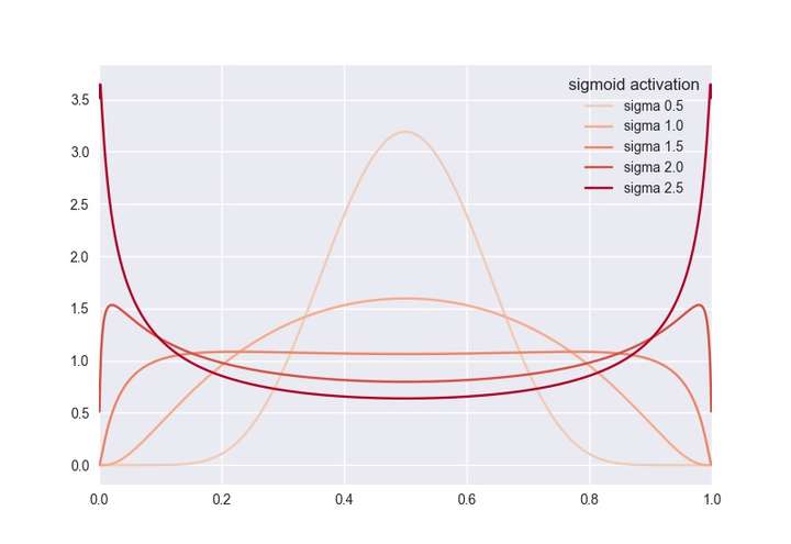 为了简化分析,我们可以假设sigmoid之前的输入分布是一个高斯分布,固定均值为0,方差不定(应该是挺一般的假设了),然后画出在不同的方差下,sigmoid函数值和导数值的分布情况,下图横轴为函数值 / 导数值,纵轴为概率密度,sigma为高斯分布的标准差: