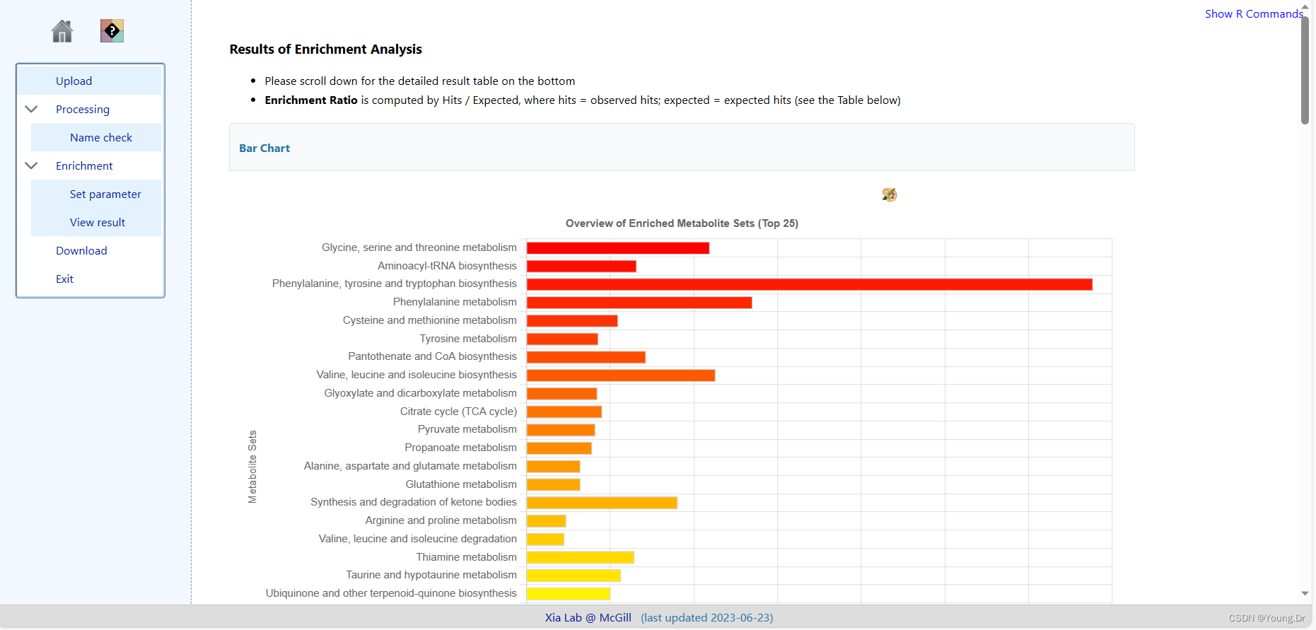 mSet<-SetMetabolomeFilter(mSet, F);mSet<-SetCurrentMsetLib(mSet, "main_class", 2);mSet<-CalculateHyperScore(mSet)