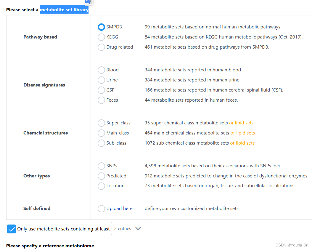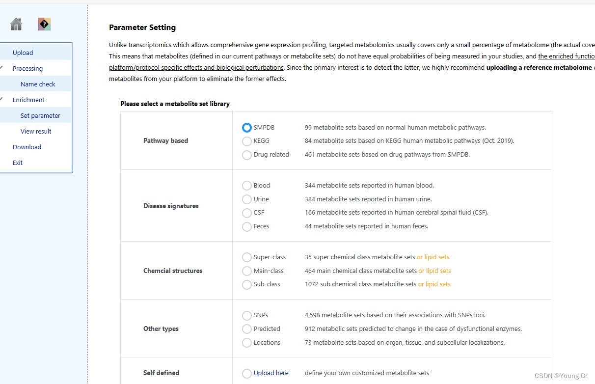 libname | Input user selected name of library, "self", "kegg_pathway", "smpdb_pathway", "blood", "urine", "csf", "snp", "predicted", "location", and "drug". |