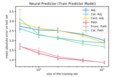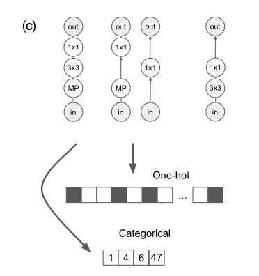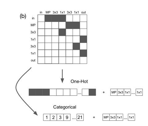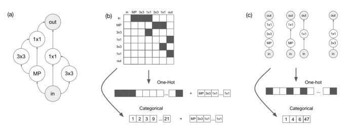 One-hot路径编码通过给每一条可能的路径提供二进制特征创建,在有向无环图中从输入结点到输出结点(例如:输入-1x1卷积层-3x3最大池化层-输出)。总维度是Sum(i=0 to n) q^i = (q^(n+1) − 1)/(q − 1)。截断的one-hot路径编码,将截断这种编码为仅包括长度为x的路径。新的维度为:Sum(i=0 to x) q^i。分类路径编码,定义为索引列表。每一索引指向Sum(i=0 to x) q^i中一条可能的路径。连续路径编码包括每一可能路径的实数值特征[0, 1],以及代表路径数的特征。就像one-hot路径编码一样,连续路径编码也能够被截断。基于路径的编码的优势在于结点不是任意分配的索引,并且同形结构会自动映射到相同的编码中。基于路径的编码的缺点在于不同的结构能够映射到相同的编码上(换句话说,e不存在)