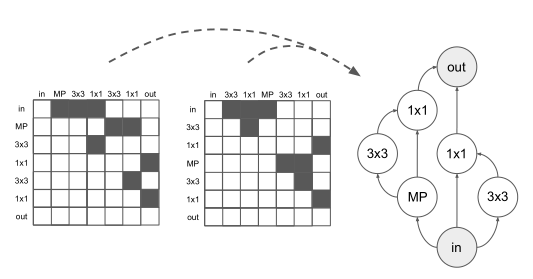 - DARTS:Differentiable Architecture Search,提出可微结构搜索方法,将结点连接和激活函数组成矩阵,每个元素代表了连接和激活函数的权重,将候选操作在搜索时使用softmax函数进行混合,从而使得搜索空间连续化并且目标函数可微。搜索结束后,将从混合操作中选取权重最大的操作作为最终网络