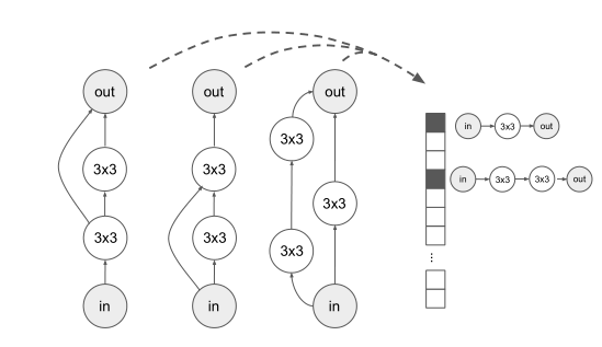 - 预设定的结构变异操作 → 新的候选,训练 + 评估 → 加入种群