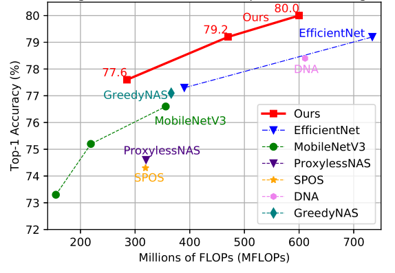 - 该方法找到的FLOPs模型,在ImageNet mobile setting上Top-1精度为79.2%,提高了4.5%的SPOS baseline(如图10)