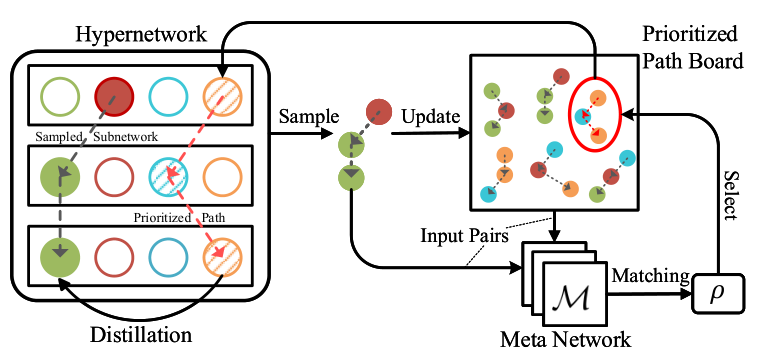 Such prioritized path distillation mechanism has three advantages. First, it does not require introducing third-party models, such as human-designed architectures, to serve as the teacher models, thus it is more flexible. Second, the matching between prioritized paths and subnetworks are meta-learned, which allows a subnetwork to select various prioritized paths to facilitates its learning. Last but not the least, after hypernetwork training, we can directly pick up the best performing architecture from the prioritized paths, instead of using either reinforcement learning or evolutional algorithms to further search a final architecture from the large-scale hypernetwork.