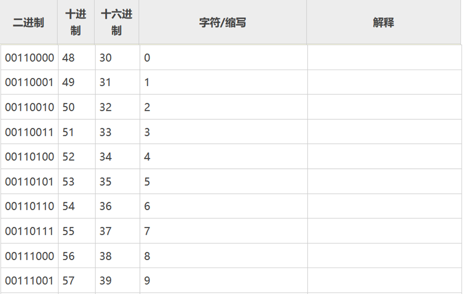 这是为什么呢?因为字符串类型的数字比较大小是从第一位开始比较其在字符编码中对应的数值大小,相等则继续比较第二位,不相等就是数值大的为大。其中数字字符对应的ASCII码值如下: