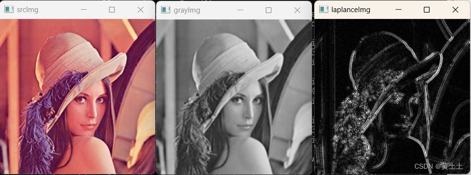 {Mat src = imread("D:\\testimg\\CSet12\\lena.png");if (src.empty()){printf("Could not load the image...\n");return -1;}else;char input_win[] = "srcImg";namedWindow(input_win, WINDOW_AUTOSIZE);imshow(input_win, src);//先平滑-高斯平滑Mat blurimg;GaussianBlur(src,blurimg,Size(3,3),0,0);//转灰度Mat grayImg;cvtColor(blurimg, grayImg,COLOR_BGR2GRAY);imshow("grayImg", grayImg);//Laplance算子Mat laplanceImg;Laplacian(grayImg,laplanceImg,CV_16S,3);convertScaleAbs(laplanceImg, laplanceImg);imshow("laplanceImg", laplanceImg);waitKey(0);return 0;