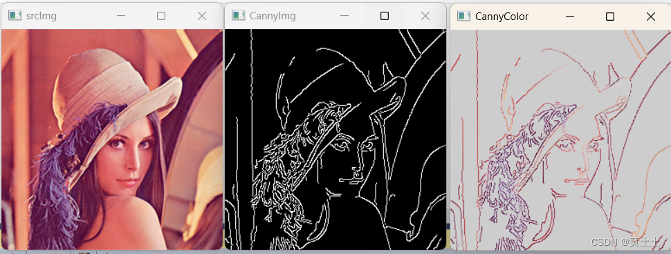 {Mat src = imread("D:\\testimg\\CSet12\\lena.png");if (src.empty()){printf("Could not load the image...\n");return -1;}else;char input_win[] = "srcImg";namedWindow(input_win, WINDOW_AUTOSIZE);imshow(input_win, src);//先平滑-高斯平滑Mat blurimg;GaussianBlur(src,blurimg,Size(3,3),0,0);//转灰度Mat grayImg;cvtColor(blurimg, grayImg,COLOR_BGR2GRAY);imshow("grayImg", grayImg);//canny算子Mat CannyImg;Canny(grayImg, CannyImg, 100,175);imshow("CannyImg", CannyImg);//彩色显示线条Mat CannyColor=Mat(src.size(),src.type());src.copyTo(CannyColor, CannyImg);imshow(" CannyColor", CannyColor);waitKey(0);return 0;