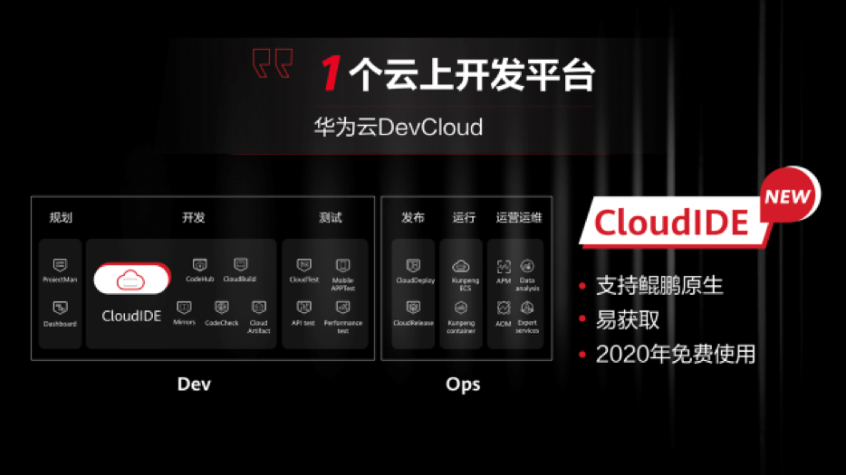 作为今年华为开发者大会的重头戏,华为推出了CloudIDE集成开发环境。作为华为云DevCloud开发平台组件之一,CloudIDE是轻量化、云原生、基于Web的集成开发环境服务,支持鲲鹏原生和多语言,打通了开发态和运行态,CloudIDE服务是华为为开发者提供的最重要服务之一。从软件开发者工具历程来看,第一代是代码编译器,直接、快速、轻量但很难使用;第二代是可视化桌面IDE,代表为微软的Visual Studio,其产品相对厚重但提供了强大的代码理解和调试能力;第三代也就是2015年微软发布了在线版本Visual Studio Code,而CloudIDE服务即瞄准了Visual Studio Code的所有特性,还支持鲲鹏、昇腾等异构计算。目前,已有超过40万用户在DevCloud上开发了超过50万个项目。华为还宣布,2020年CloudIDE对所有鲲鹏实例全年免费。