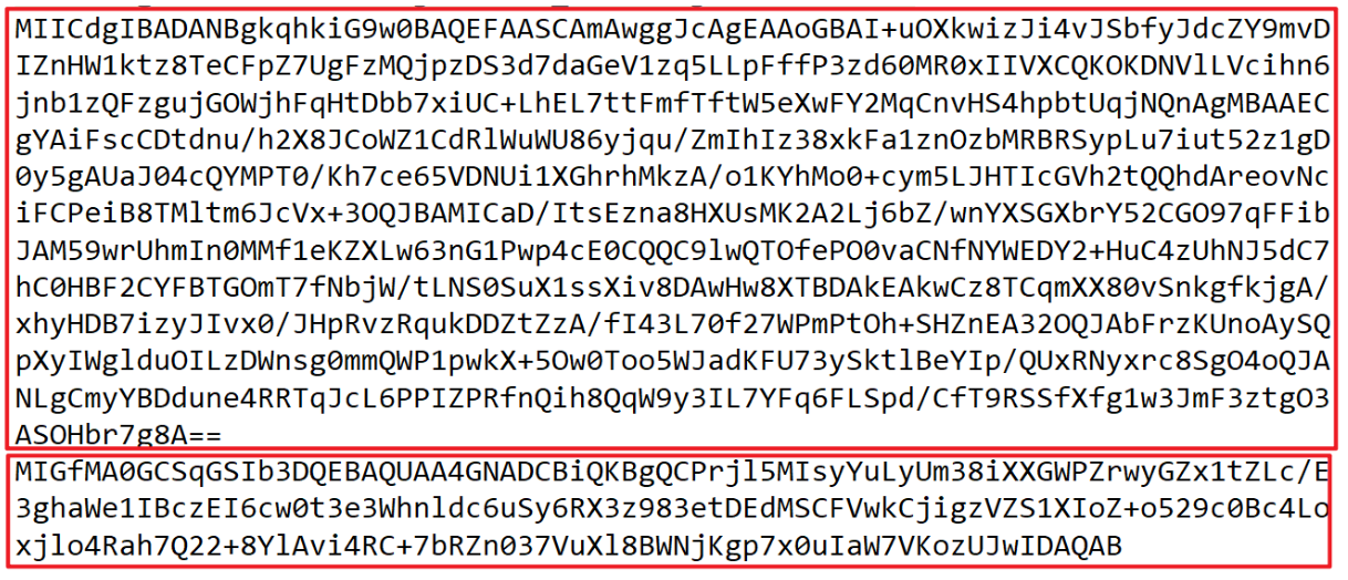 public class RSAdemo {public static void main(String[] args) throws Exception {// 加密算法String algorithm = "RSA";// 创建密钥对生成器对象KeyPairGenerator keyPairGenerator = KeyPairGenerator.getInstance(algorithm);// 生成密钥对KeyPair keyPair = keyPairGenerator.generateKeyPair();// 生成私钥PrivateKey privateKey = keyPair.getPrivate();// 生成公钥PublicKey publicKey = keyPair.getPublic();// 获取私钥字节数组byte[] privateKeyEncoded = privateKey.getEncoded();// 获取公钥字节数组byte[] publicKeyEncoded = publicKey.getEncoded();// 对公私钥进行base64编码String privateKeyString = Base64.encode(privateKeyEncoded);String publicKeyString = Base64.encode(publicKeyEncoded);// 打印私钥System.out.println(privateKeyString);// 打印公钥System.out.println(publicKeyString);}