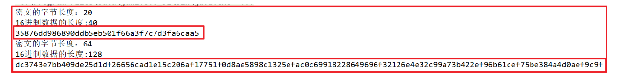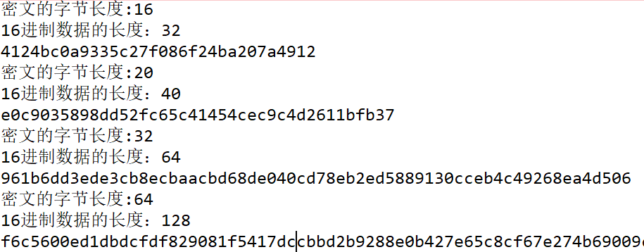 // System.out.println(Base64.encode(digest));// 创建对象用来拼接StringBuilder sb = new StringBuilder();for (byte b : digest) {// 转成 16进制String s = Integer.toHexString(b & 0xff);if (s.length() == 1){// 如果生成的字符只有一个,前面补0s = "0"+s;}sb.append(s);}System.out.println("16进制数据的长度:" + sb.toString().getBytes().length);return sb.toString();}private static String getDigest(String input, String algorithm) throws Exception {MessageDigest messageDigest = MessageDigest.getInstance(algorithm);// 消息数字摘要byte[] digest = messageDigest.digest(input.getBytes());System.out.println("密文的字节长度:" + digest.length);return toHex(digest);}