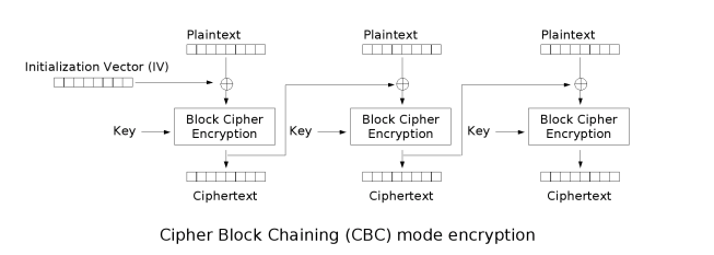 CBC : Cipher-block chaining, 密码块链接. 每个明文块先与前一个密文块进行异或后,再进行加密。在这种方法中,每个密文块都依赖于它前面的所有明文块