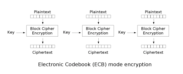 ECB : Electronic codebook, 电子密码本. 需要加密的消息按照块密码的块大小被分为数个块,并对每个块进行独立加密
