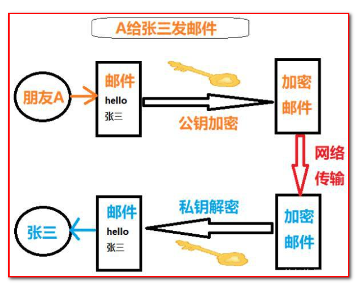 第二步:A或者B写邮件给张三:A先用公钥对邮件加密,然后张三收到邮件之后使用私钥解密。
