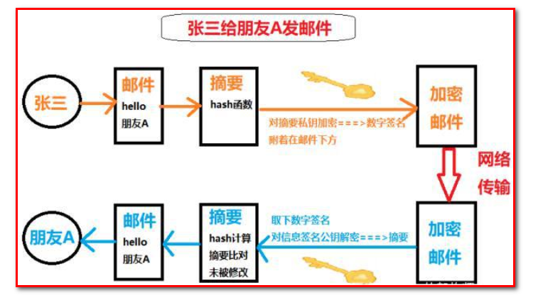 (1)张三写完邮件,先用hash函数生成邮件的摘要,附着在文章上面,这就完成了数字签名,然后张三再使用私钥加密。就可以把邮件发出去了。