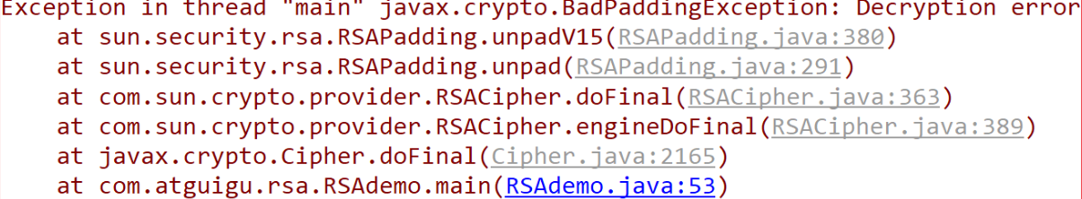public class RSAdemo {public static void main(String[] args) throws Exception {String input = "硅谷";// 加密算法String algorithm = "RSA";// 创建密钥对生成器对象KeyPairGenerator keyPairGenerator = KeyPairGenerator.getInstance(algorithm);// 生成密钥对KeyPair keyPair = keyPairGenerator.generateKeyPair();// 生成私钥PrivateKey privateKey = keyPair.getPrivate();// 生成公钥PublicKey publicKey = keyPair.getPublic();// 获取私钥字节数组byte[] privateKeyEncoded = privateKey.getEncoded();// 获取公钥字节数组byte[] publicKeyEncoded = publicKey.getEncoded();// 对公私钥进行base64编码String privateKeyString = Base64.encode(privateKeyEncoded);String publicKeyString = Base64.encode(publicKeyEncoded);// 创建加密对象// 参数表示加密算法Cipher cipher = Cipher.getInstance(algorithm);// 初始化加密// 第一个参数:加密的模式// 第二个参数:使用私钥进行加密cipher.init(Cipher.ENCRYPT_MODE,privateKey);// 私钥加密byte[] bytes = cipher.doFinal(input.getBytes());System.out.println(Base64.encode(bytes));// 私钥进行解密cipher.init(Cipher.DECRYPT_MODE,publicKey);// 对密文进行解密,不需要使用base64,因为原文不会乱码byte[] bytes1 = cipher.doFinal(bytes);System.out.println(new String(bytes1));}