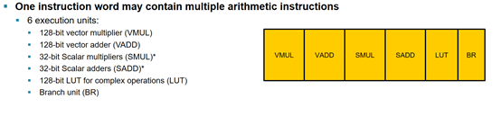这里,一个128位宽的乘加和同样宽度的加法单元承担了之前标量和向量乘加,而查表运算也和加法单元混合在一起。和之前完全不同的是,这里的输入始终是128位宽的单个指令,而不是VLIW的6条指令,从而提高计算单元利用率。每时钟周期进来的数据,只能到FMA和ADD/TBL单元中的一个,没法同时进去,某种程度上减少了面积的有效利用率。