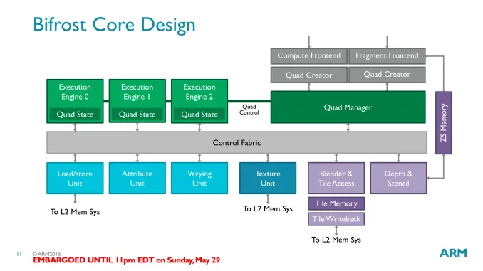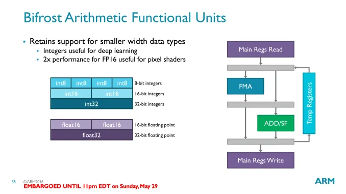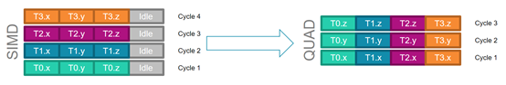 为了配合这一设计,Mali还做出了一个新的调整,如上图。由之前的按照像素点的RGBA四通道的矢量运算方式,改成四个像素各抽取一个颜色通道,塞到上面的FMA,同时运行四线程。由于大部分情况下,一个块上的256个像素的相同通道总是做一样的计算,保证了这个设计的高利用率。如果相邻四个点每个通道的运算都不一样,那效率自然会降低。