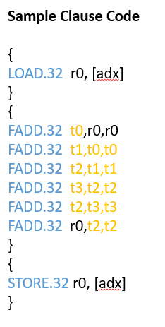 再下层,具体到每一个着色器里面的执行引擎,每个时钟的输入是一个程序块Clause。Clause就是某段既没有分支也没有访存的程序,当所有的输入数据都已经从内存读取并存放于寄存器后,这段程序会被无间断执行,直到结果输出。执行过程中,临时寄存器会被用来解决通用寄存器不够用的问题。而当输入数据还未取到,那么就切换到另一个准备就绪的程序块。
