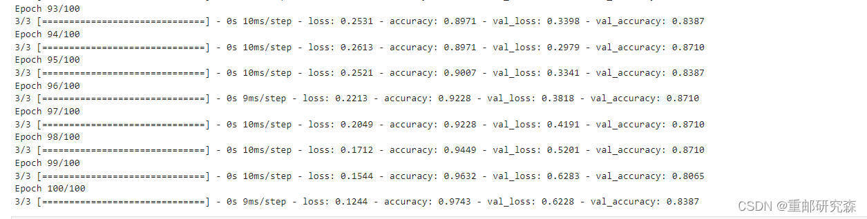 epochs = 100history = model.fit(X_train, y_train, epochs=epochs, batch_size=128, validation_data=(X_test, y_test),verbose=1)