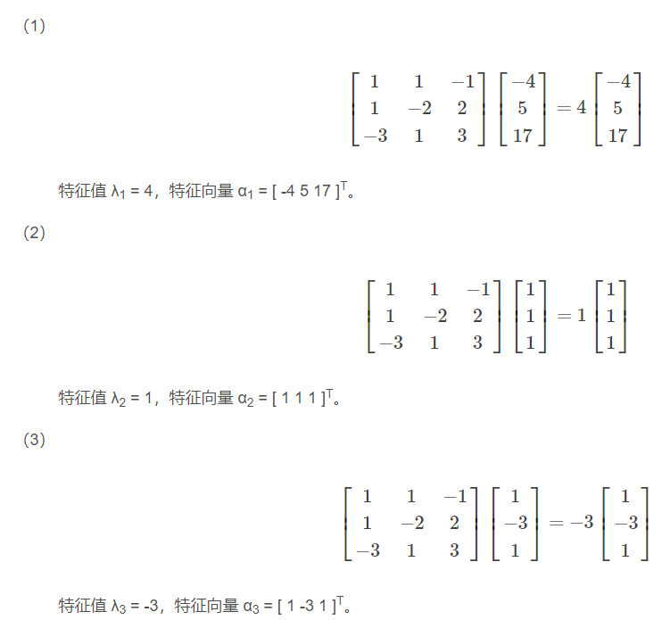 则称 λ=4 为矩阵A的特征值,(为了方便,简称 4 为特征值);也称 α=[ -4, 5, 17 ]T 是矩阵A属于特征值为 4 的一个特征向量。