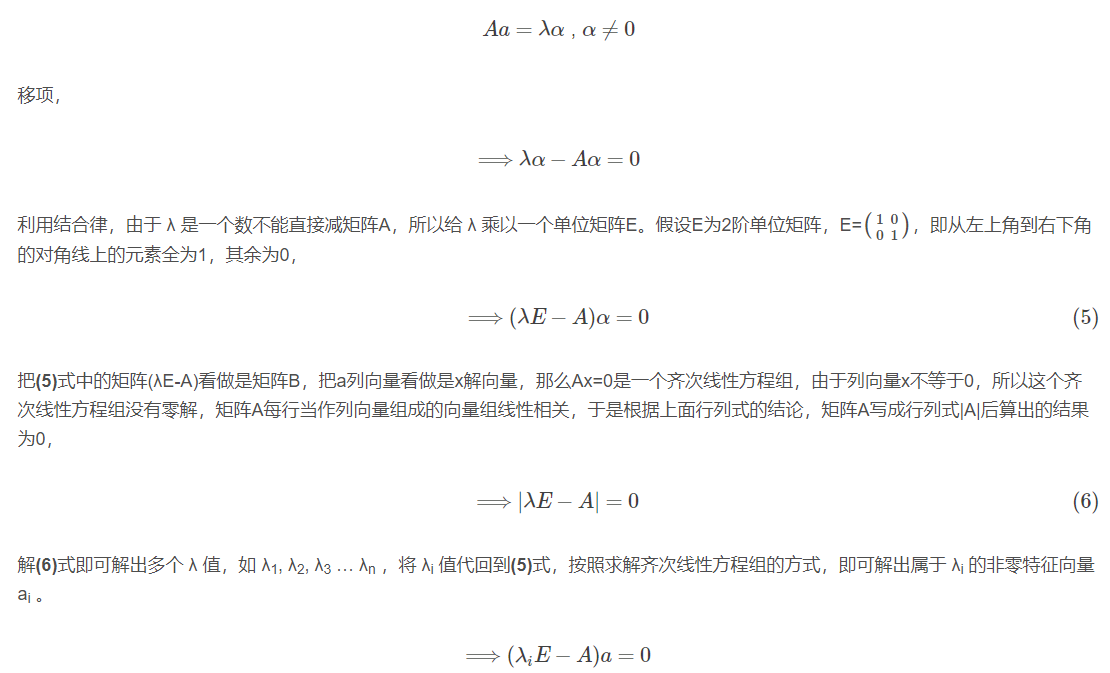 显然,每个等式两边相等, Aα = λα 成立!(如果不知道为什么可以还原成方程组的话,请翻回到上面的非齐次方程组部分,可发现在这里 α 相当于解向量, λα 相当于 b 向量)