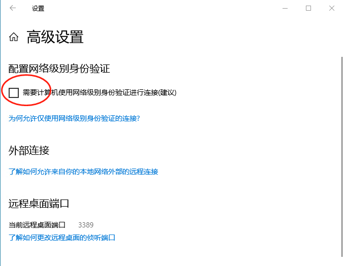 2.开启 Windows server 远程协助服务,同时还要将高级设置中的 网络级别身份验证取消,否则会出现无法连接的提示: