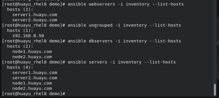- ansible host-pattern -m module [-a 'module arguments'] [-i inventory]