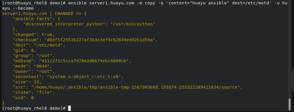 ansible localhost -m command -a 'id' -u student #通过-u选项使用huayu用户进行连接并执行id命令
