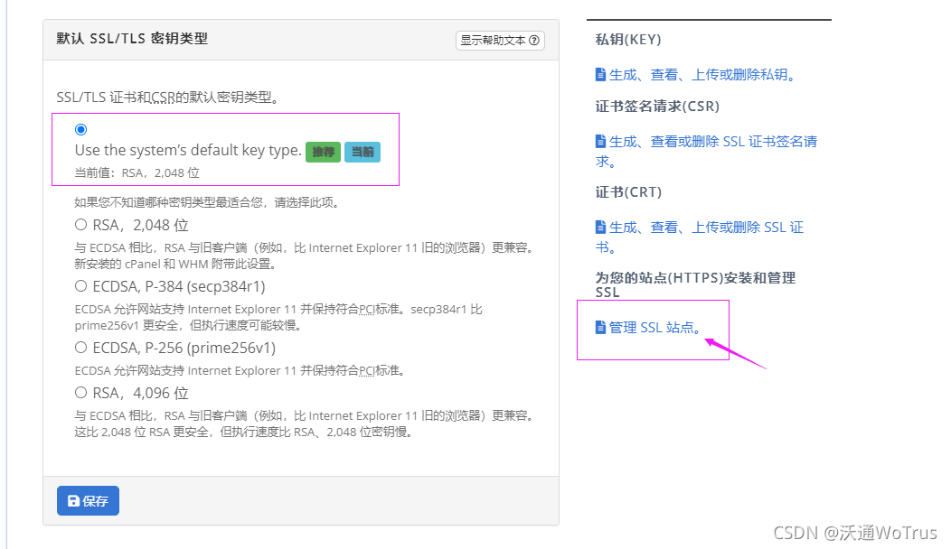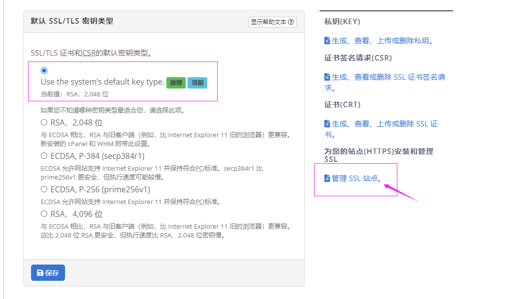 注意:默认SSL/TLS密钥类型(TLS 1.3、TLS 1.2),会导致古老的浏览器无法访问,但安全性很高,适合电子商务、支付平台。如果纯内容网站。